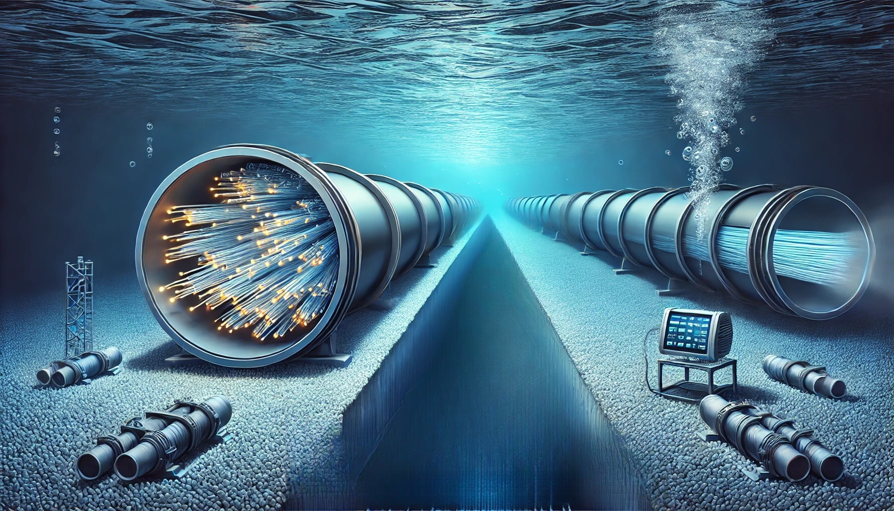Interception and Analysis of International Fiber Optic Cables involve recording and analyzing traffic on international fiber optic cables. This occurs when they are cut and connected to intelligence systems. The imagery of a vast underwater fiber internet cable and its associated DWDM device visually depicts the complex nature of intercepting and analyzing data from international communication infrastructure.